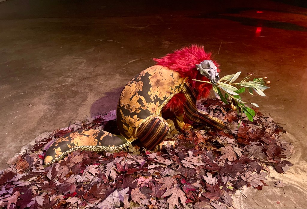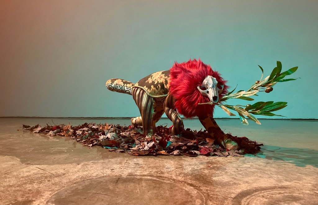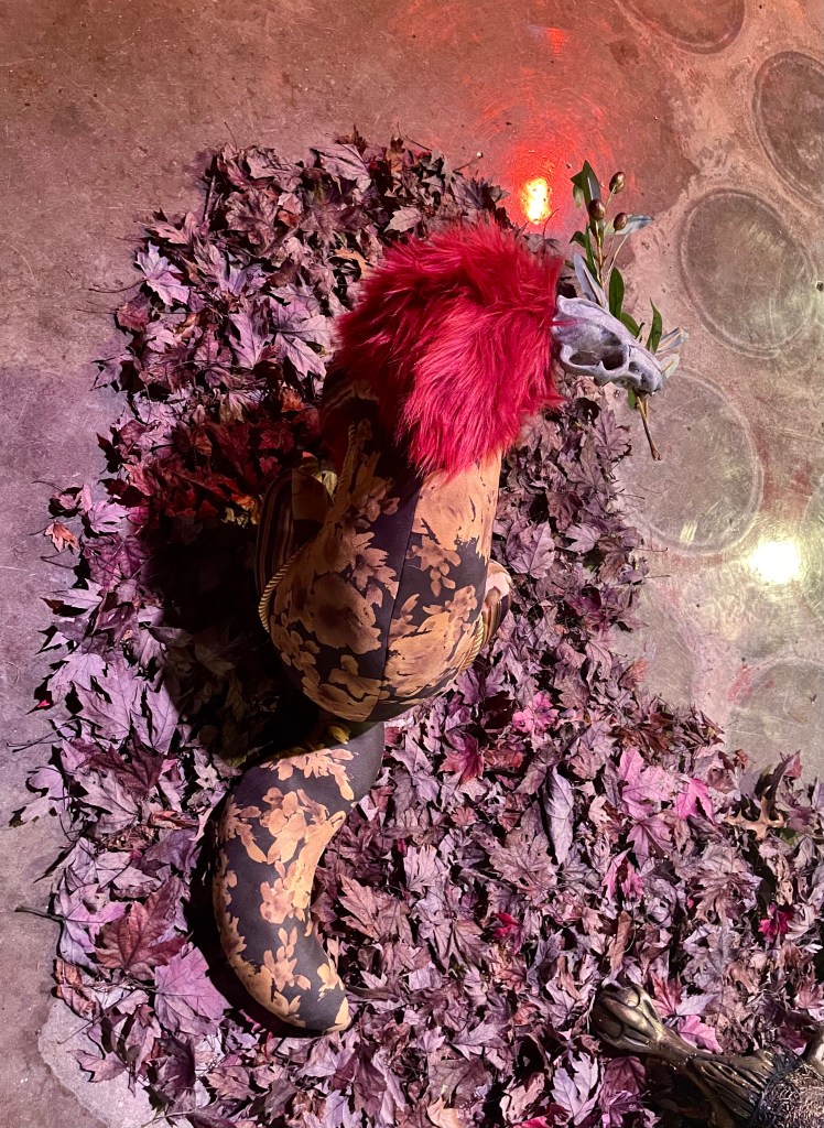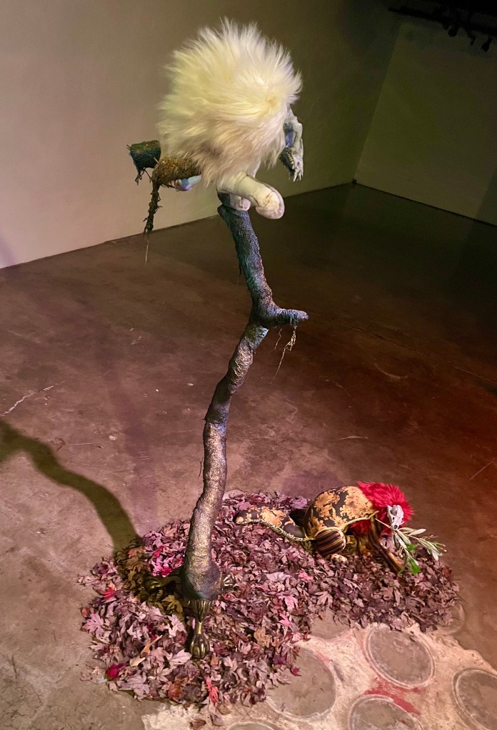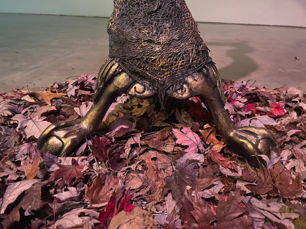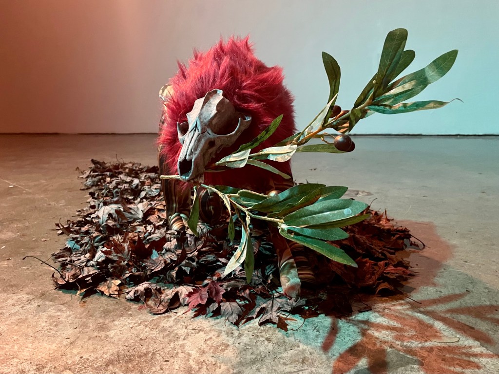 Steel armatures, Steel conduit, Cast iron, Hand sculpted/Cast resin opossum and fox skulls, Fine fabrics, Latex, Paint, Leaves.