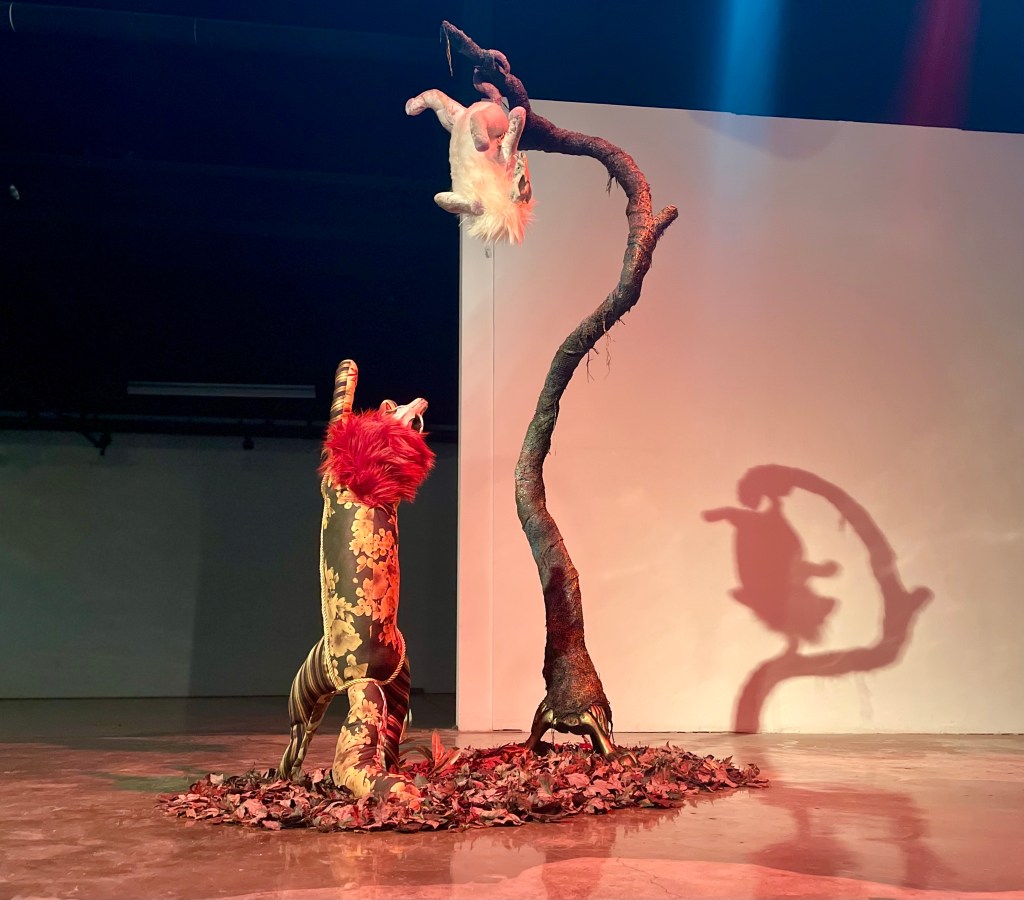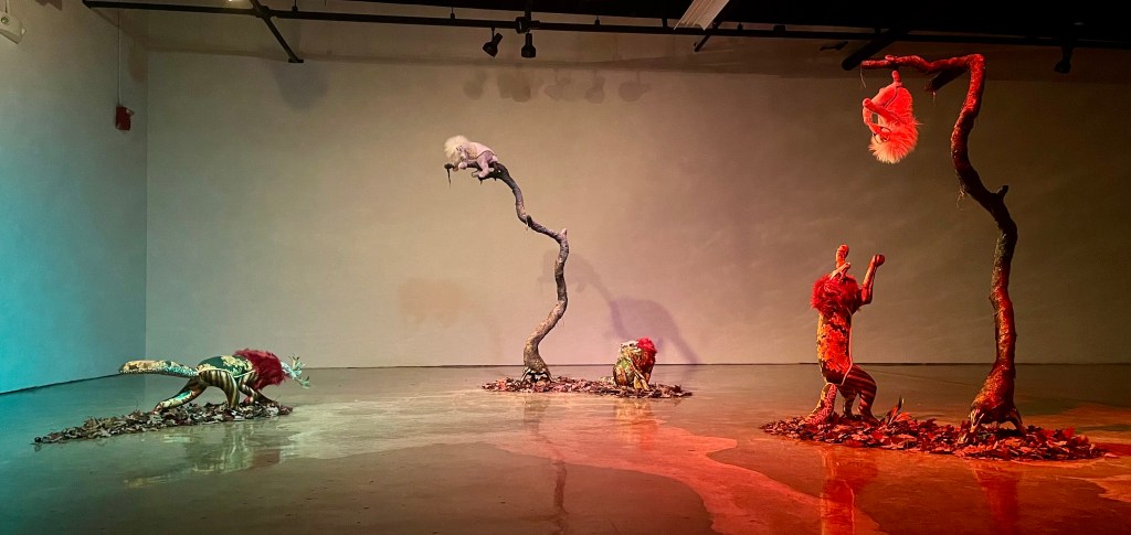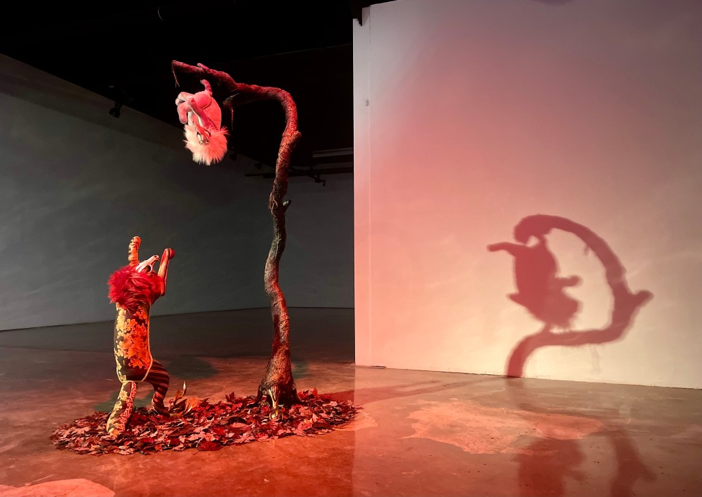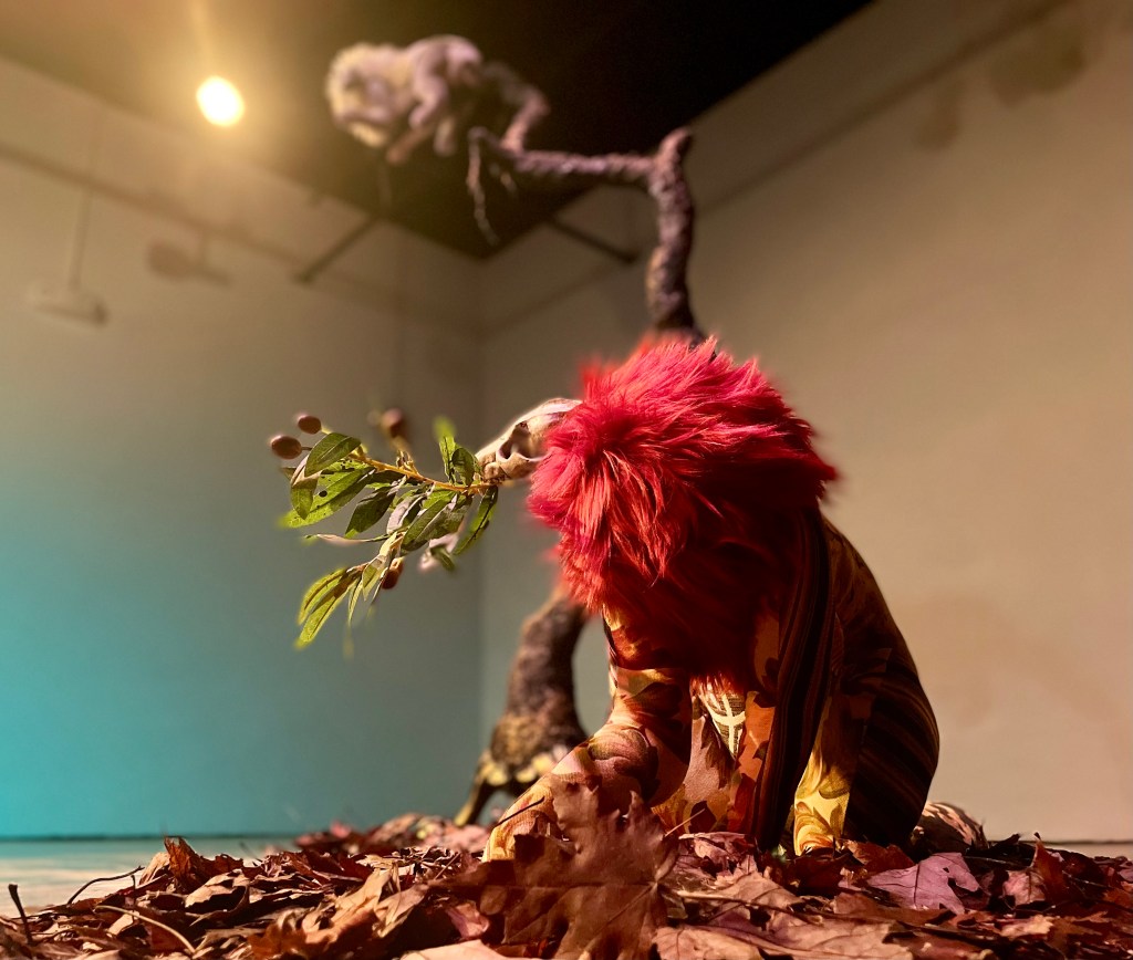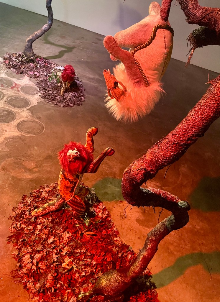 Steel armatures, Steel conduit, Cast iron, Hand sculpted/Cast resin opossum and fox skulls, Fine fabrics, Latex, Paint, Leaves.