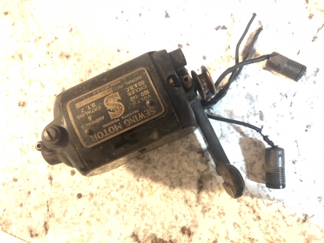 This salvaged motor was removed from a separate sewing machine. It originally did not function. The wiring was removed and replaced. After cleaning and reassembly, the motor functions properly.