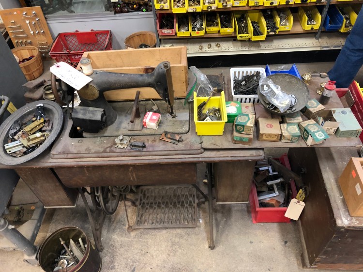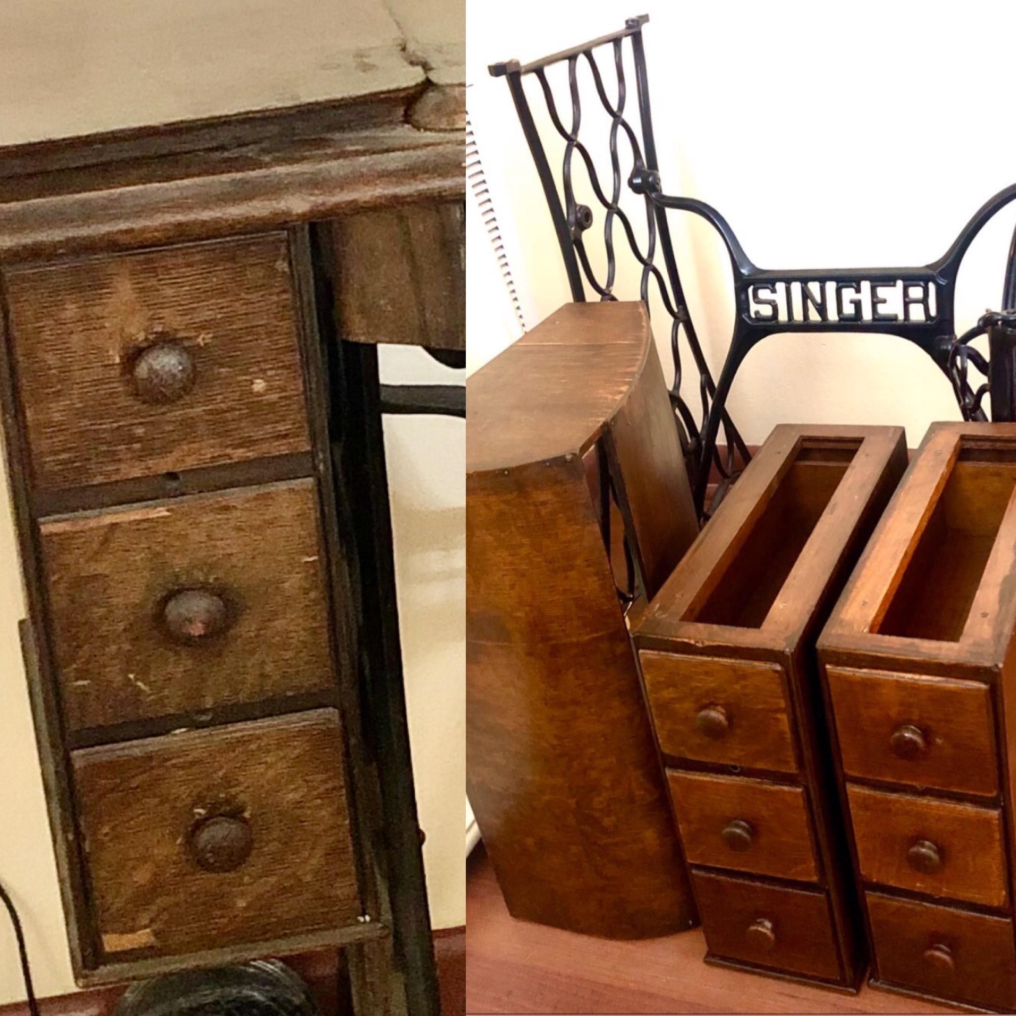 Before and after: The sewing machine cabinet had peeling veneer and sections had to be glued and repaired. The machine was then stripped and stained before finishing it with lacquer and reassembling. The machine itself was meticulously cleaned, the add-on motor and foot pedal were removed, and oil was added to help things run properly. Finally, a new leather belt was installed to allow for the original foot pedal’s function. No more rust or grime, she functions beautifully!