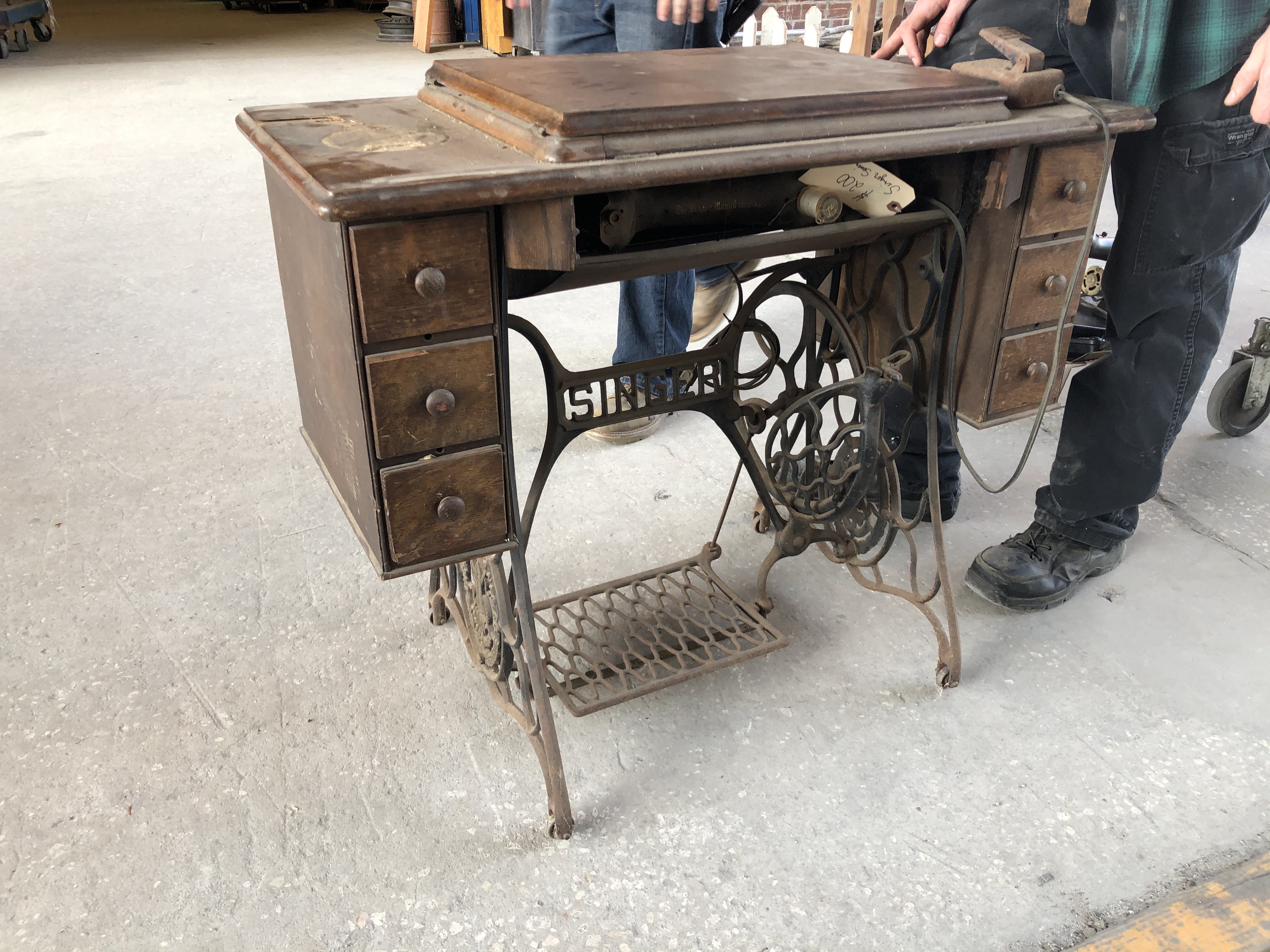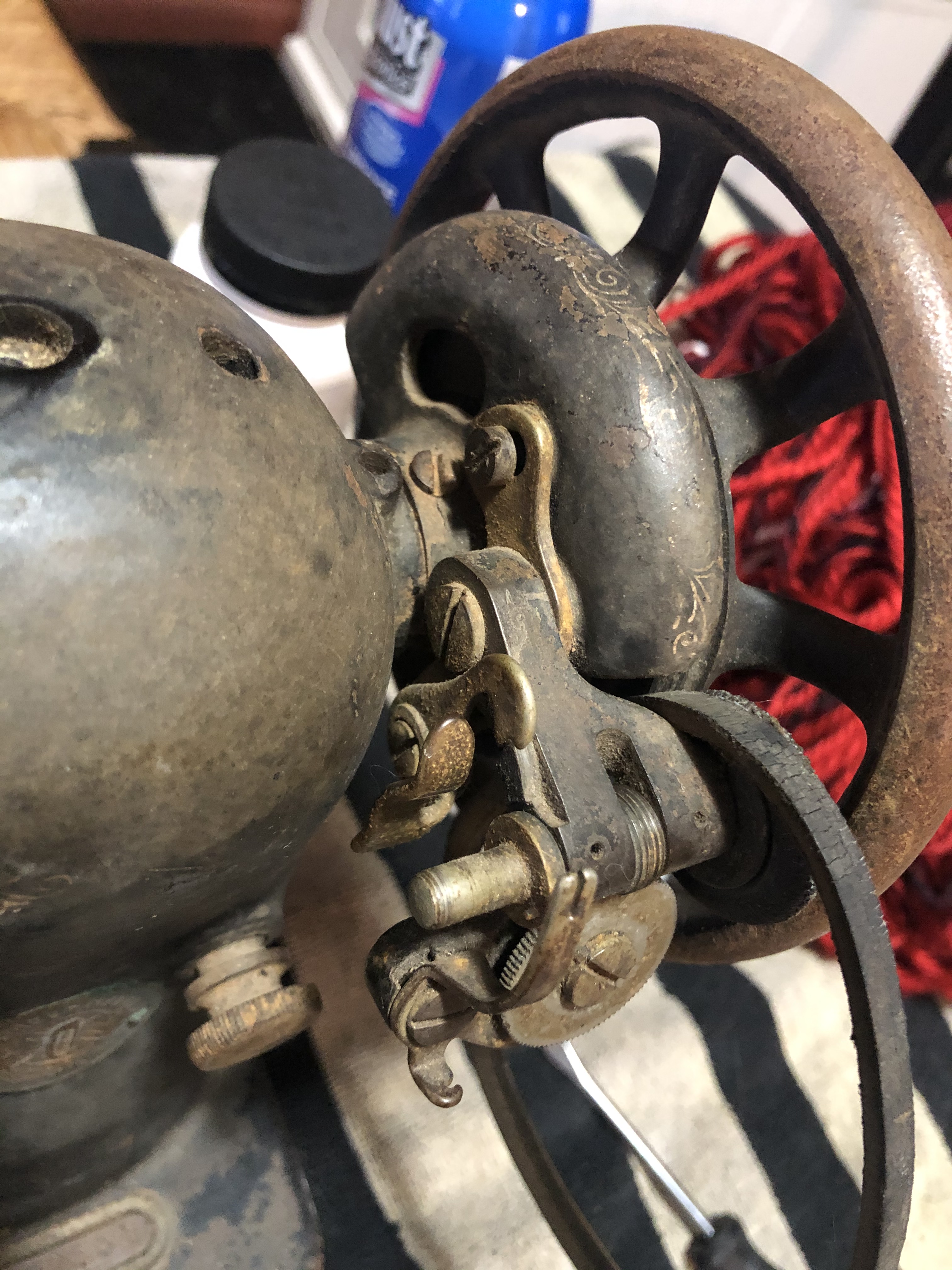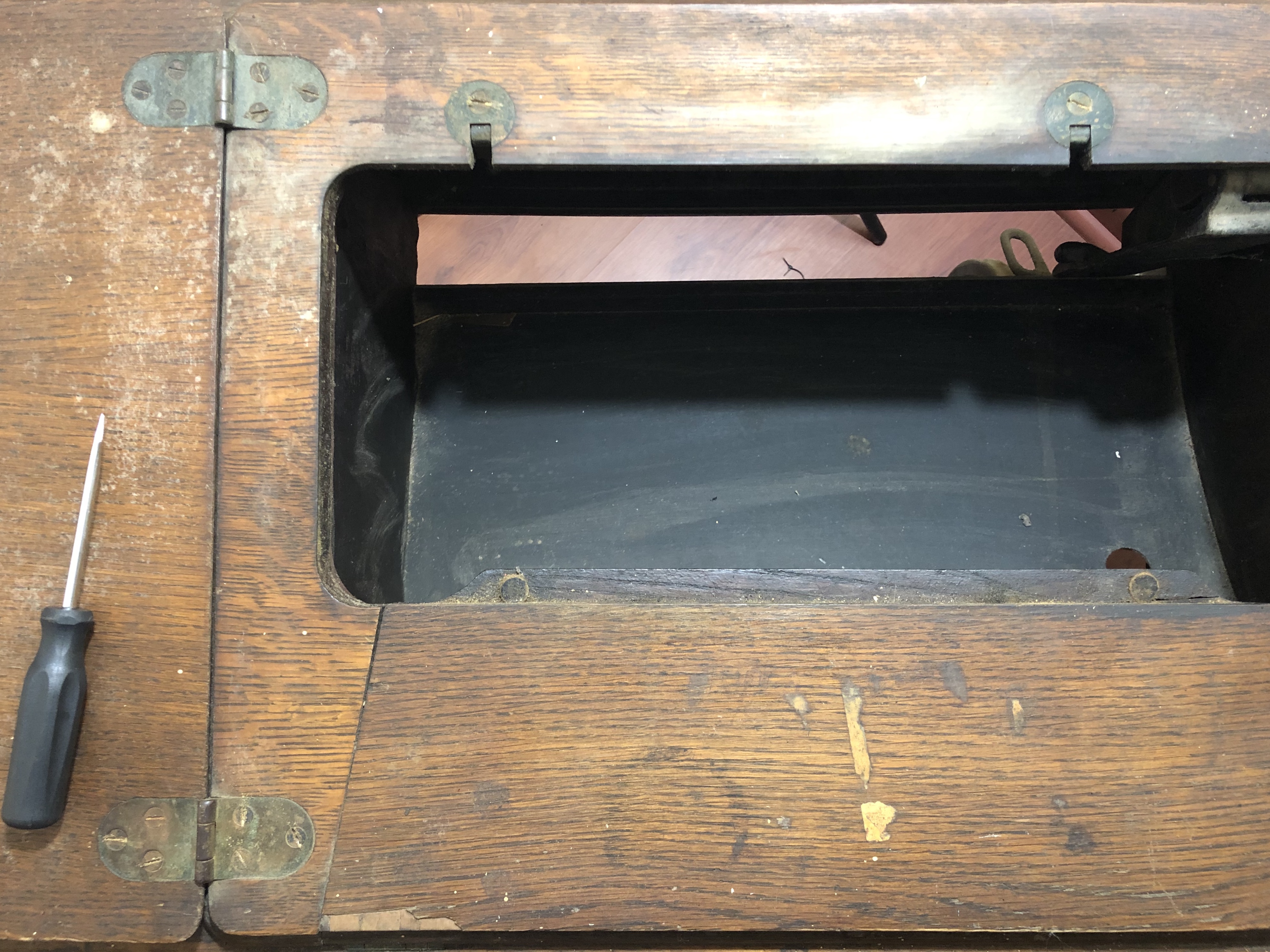 The original state of this Singer brand sewing machine was rough. It was found in a flea-market setting that was not climate controlled. Rust and water damage were clearly visible. Someone had removed the center drawer in order to add an aftermarket foot-pedal. The machine did not function.