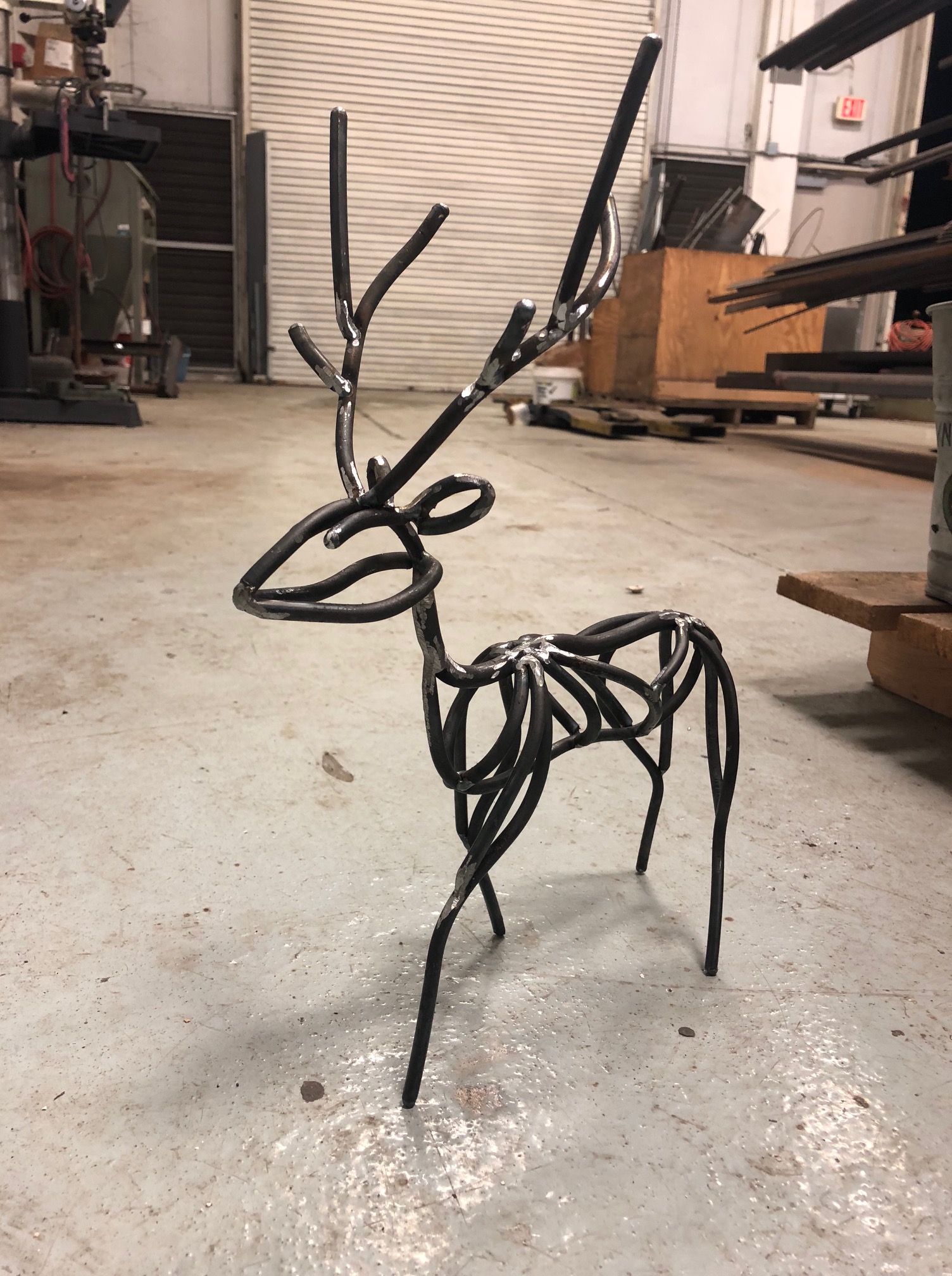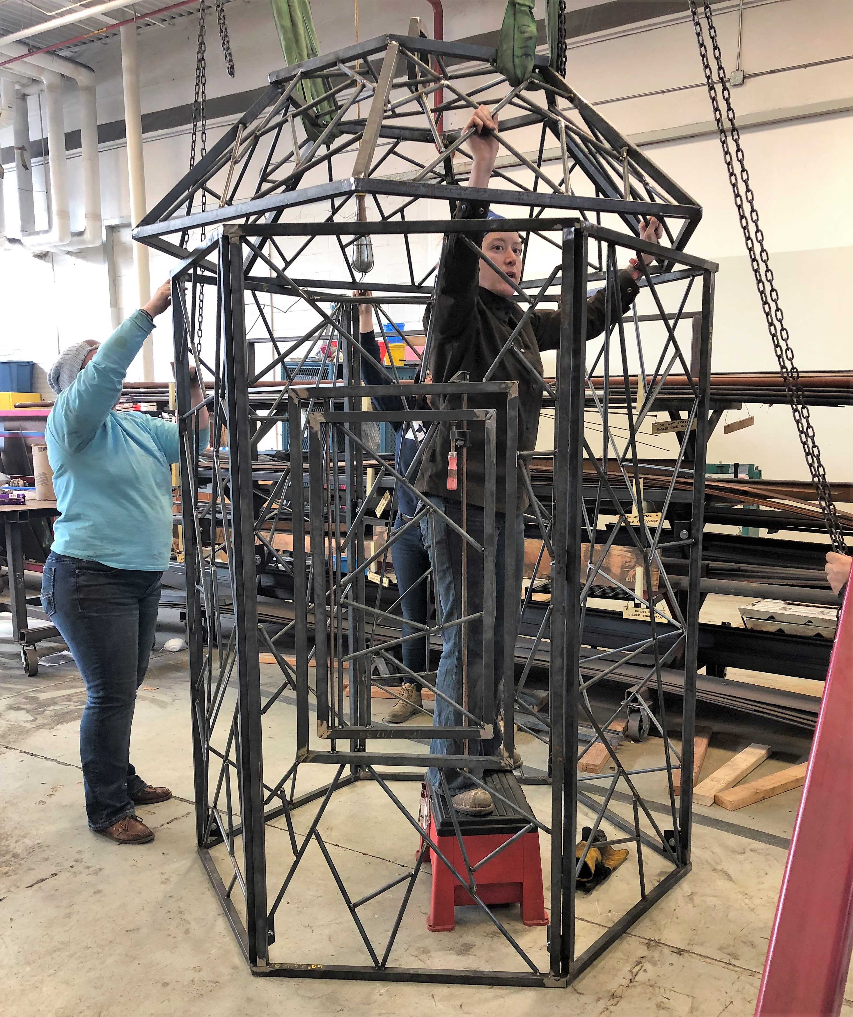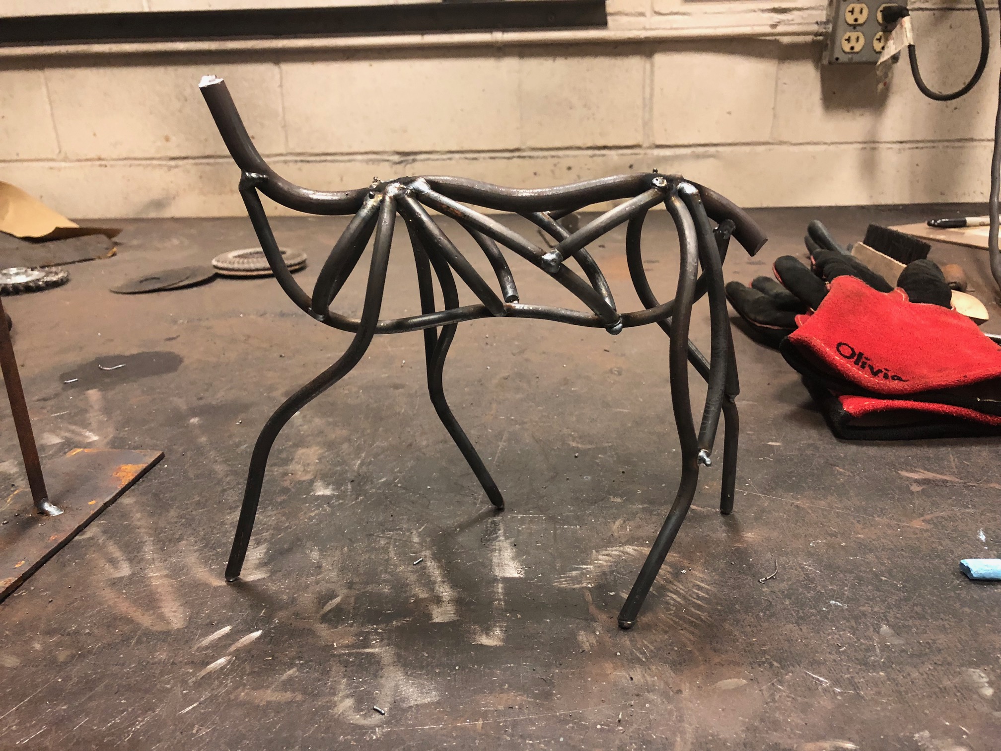 Project assembly often includes cutting and welding many identical pieces to form a greater sculptural work.