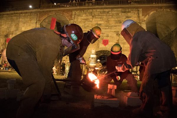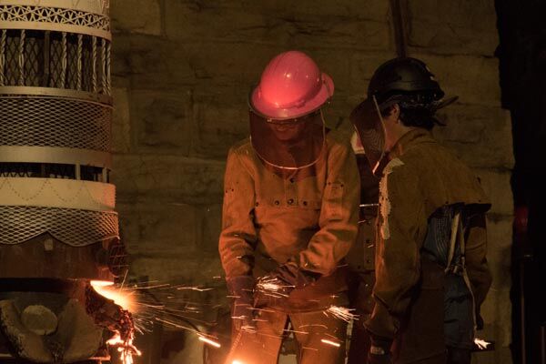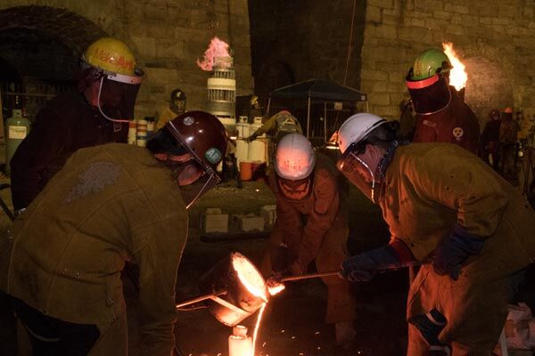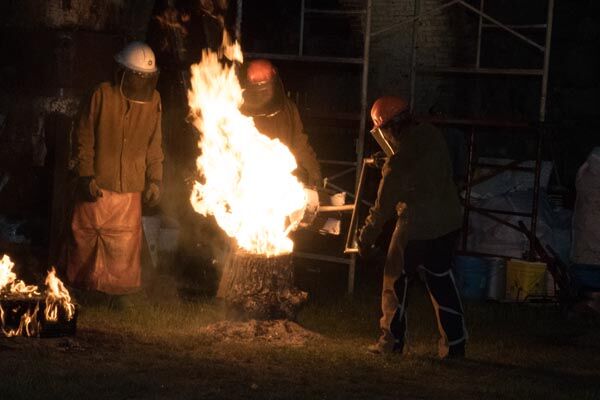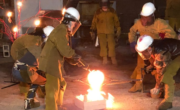 Metal casting is a very involved process that often requires a team or “pour crew” to maintain a running furnace. Meanwhile, other members of the crew move the molten metal to it’s final destination-sand or ceramic shell molds that are designed to withstand the extreme heat-in order to create an artwork(s).