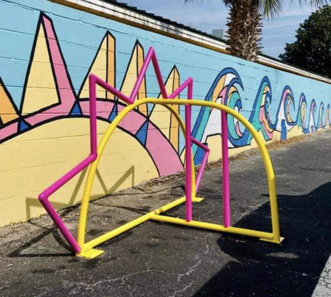 A functional, custom bike rack commissioned for Word Revolt Gallery in Atlantic Beach, Florida.